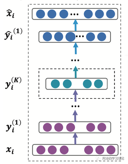 SDNE 采用的自编码器比较深,有多个隐藏层,如下图所示:
