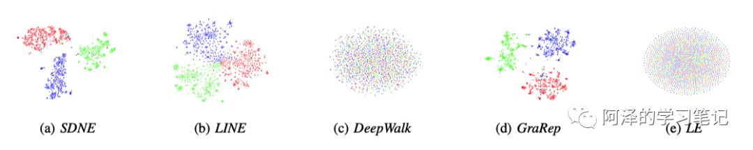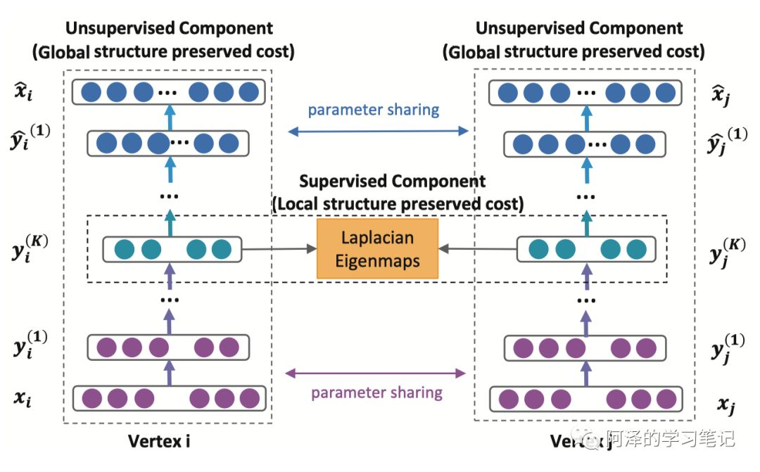 以左边的为例:输入为邻接矩阵,输出为重构后的邻接矩阵,通过优化重构误差来捕捉全局结构特征;而中间一排, 就是我们需要的 Embedding 向量,模型通过拉普拉斯特征特征映射(Laplacian Eigenmaps)优化的代价函数使得相邻节点的 Embedding 向量距离更近,从而捕捉节点的局部特征。