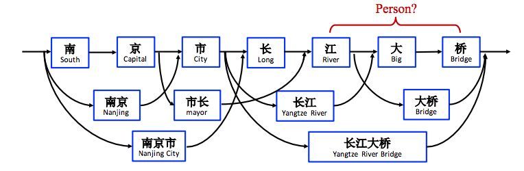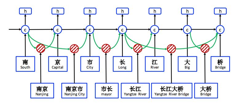 基于字符的 NER 的一个缺陷在于无法充分利用显性的词和词序信息,而它们是很有用的。为了解决这一问题,本论文研究者利用 lattice LSTM 来表征句子中的 lexicon word,从而将潜在词信息整合到基于字符的 LSTM-CRF 中。如图 1 所示,研究者使用一个大型自动获取的词典来匹配句子,进而构建基于词的 lattice。因此,词序如「长江大桥」、「长江」和「大桥」可用于语境中的潜在相关命名实体消歧,如人名「江大桥」。