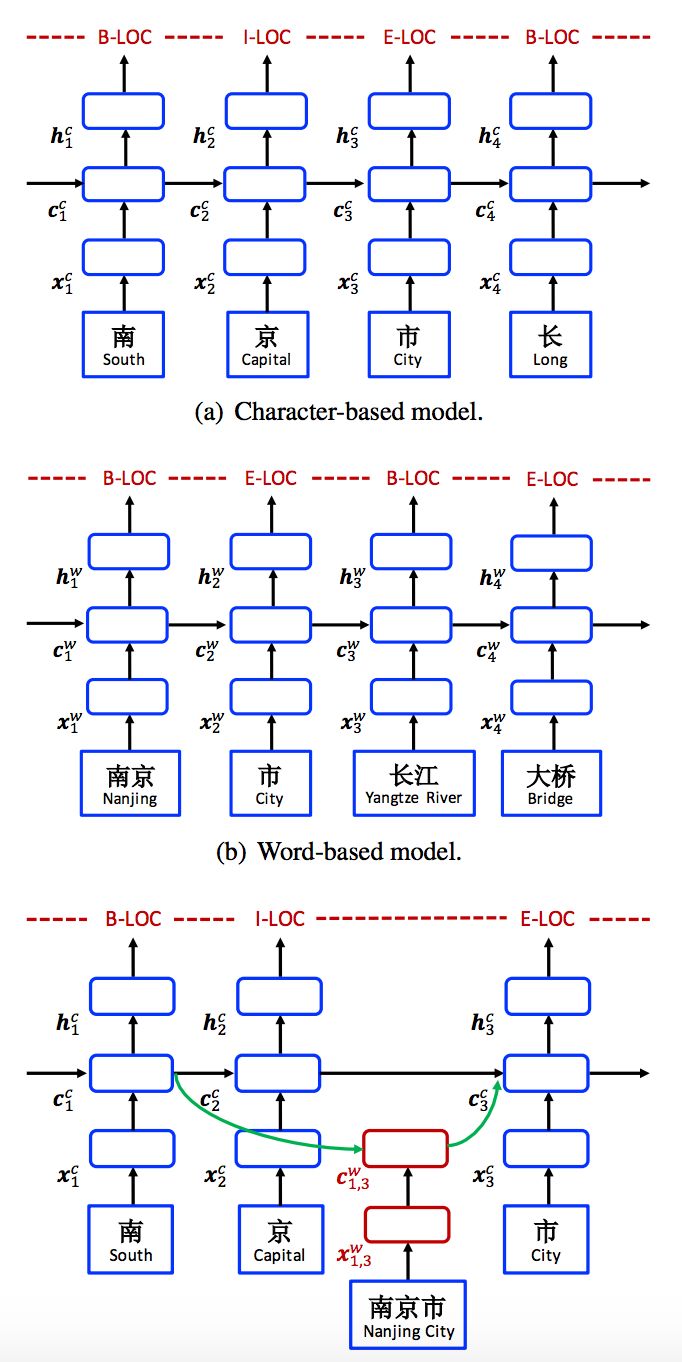 研究者遵循最好的英文 NER 模型(Huang et al., 2015; Ma and Hovy, 2016; Lample et al., 2016),使用 LSTM-CRF 作为主要网络结构。形式上,指定输入句子为 s = c_1, c_2, . . . , c_m,其中 c_j 指第 j 个字符。s 还可以作为词序列 s = w_1, w_2, . . . , w_n,其中 w_i 指句子中的第 i 个词,使用中文分词器获得。研究者使用 t(i, k) 来指句子第 i 个词中第 k 个字符的索引 j。以图 1 中的句子为例。如果分词是「南京市 长江大桥」,索引从 1 开始,则 t(2, 1) = 4 (长),t(1, 3) = 3 (市)。研究者使用 BIOES 标记规则(Ratinov and Roth, 2009)进行基于词和基于字符的 NER 标记。