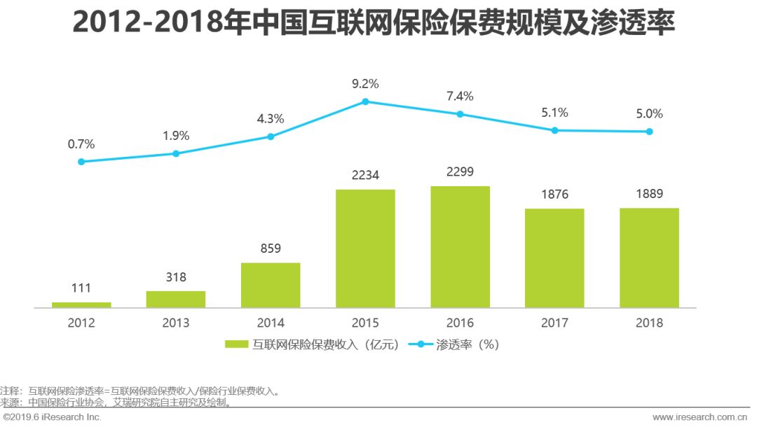 中国保险行业协会的公开数据显示,互联网保险在2012-2015年的4年间经历了爆发式的增长,保费收入增长近20倍,互联网保险渗透率于2015年达到了9.2%。然而从2016年开始,互联网保险保费规模增长陷入停滞并开始减少,渗透率连年下滑,到了2018年渗透率仅有5%,纠其主要原因是受保险业政策影响,给互联网保险行业发展带来了短期阵痛,但从长远发展来看,政策调整后的互联网保险行业能够更加健康的发展。