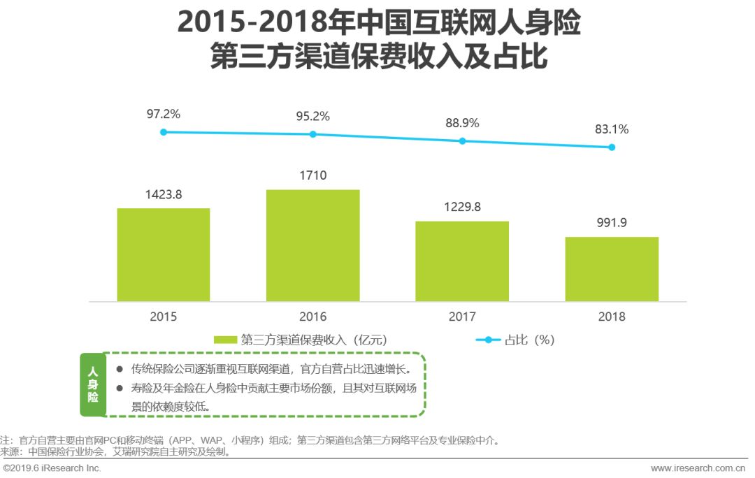 互联网保险销售渠道主要分为官方自营渠道和第三方渠道。从渠道侧市场份额来看,第三方渠道占据互联网保险的主要保费收入来源。得益于互联网保险产品结构的不断优化,在互联网保险整体保费增长疲软的背景下,通过第三方渠道的产生的保费在互联网财产险领域依然保持快速增长。而互联网人身险领域中第三方渠道占比虽然有所下降,但依然占绝对主导地位。相比于官方自营渠道,第三方网络平台拥有更多的用户场景,而专业保险中介能够为用户提供高质量的服务,两者都不仅仅是销售方式的转变,而是赋予了更多互联网保险的核心意义。