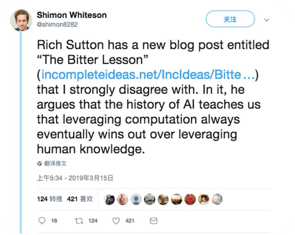 GPT-3出现以后,国际上也出现了比较多的争论,牛津大学Shimon Whiteson教授与强化学习之父Richard S. Sutton教授的争论也引发圈内一大波人的思考: