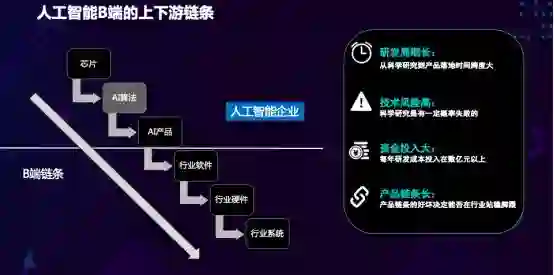 B端的难在于什么?它的链条很长,从芯片到算法,到应用,再到最后的行业的软件、硬件、系统。整个链条非常长。作为一个初创的人工智能企业,可能一开始只有一个算法,除此之外,什么都没有,你想触达到客户难上加难。资金投入和风险问题,也是常见问题。