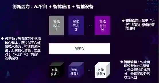 第二,要有智能设备。第三,要有AI平台。如果只做平台,不做设备和应用也不行。为什么呢?只做平台,比如说科大讯飞、百度,百度的平台做得很好,但是没有触达到行业终端设备和行业应用,行业应用也不会觉得能解决它的真正问题。所以一定是平台加设备,再加上应用。