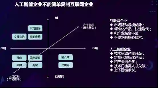 一开始。人工智能企业可能学习互联网企业。互联网企业可以快速扩张,可以快速把产业做大,但走了两三年,发现这个路并不好走。为什么?我们可以看一下,AI与互联网,实际上是两个差别比较大的技术。另外,还分B端和C端,而以前的互联网巨头,大部分都是在C端和偏个人化。比如微信、淘宝、美团、百度。这些都是偏C端的,依赖的是人口红利,市场驱动。他们单纯地把规模做大,就可以了。