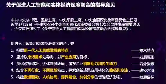 今年3月,《关于促进人工智能和实体经济深度融合的指导意见》发布。这个《意见》非常高瞻远瞩,把人工智能和实体经济如何融合的思路给大家摆出来了。相信大家已经看到过了。在这里,我再跟大家理一遍。促进人工智能和实体经济深度融合要怎么样做?
