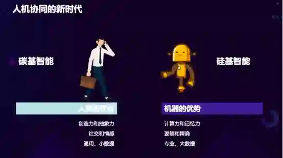 我们认为,未来20年以内的主线,应以人机协同为主要特点。因为人有人的智慧,机器有机器的优点。人的优点是有创造力,可以记下来很抽象的东西。新一代人工智能还是靠大数据。要让机器识别一个苹果,可能需要上千张苹果图片,才能把苹果识别出来。人还可以通用,学习法则之后,就可以牵引了,但机器还不行。碳基智能和硅基碳基智能应该可以协作的。这个技术应该怎么发挥价值?人机协作有三个阶段:感知、认知、决策,都需要做到。数字经济从1999年互联网开始大规模应用,到现在大概差不多20年。电商、社交、购物、游戏,都是属于数字经济。