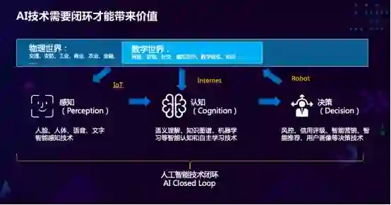 第一感知,从真实世界感知到一个信息,比如说人脸识别,或者说是自动驾驶识别物体,都要先感知,感知层面是第一步,包括人脸、语音、文字、这些都属于感知。感知完了,就要做认知,认知可以从真实世界认知,也可以从数字世界认知,能够从数据里把知识图谱、模型总结出来。然后,再把这个知识图谱、模型给到决策层,最后才能为银行做出贷款的风控模型做风控贷款,给商家做出促销模型帮助商家促销。这三步做完以后,才能真正改善我们的世界,中间可能还会用到物联网技术、机器人技术等。