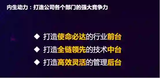 第二,公司的内部一定要够强大,打造使命必达的行业前台,打造全链领先的技术中台,打造高效灵活的管理后台。