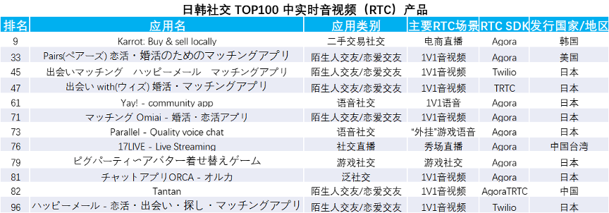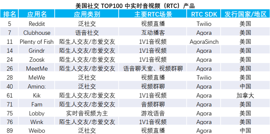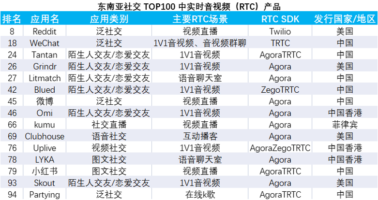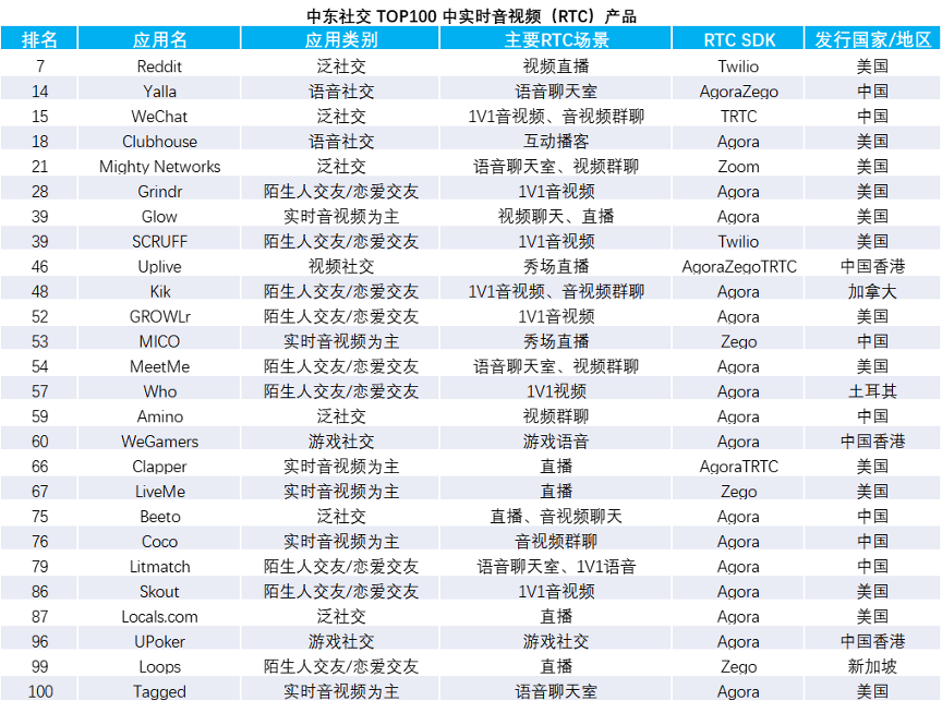 我们挑选了2022年1月data.ai在中东、东南亚、日韩、美国等区域市场活跃用户数排名TOP100的社交软件,筛选其中使用RTC技术的应用来进行分析。
