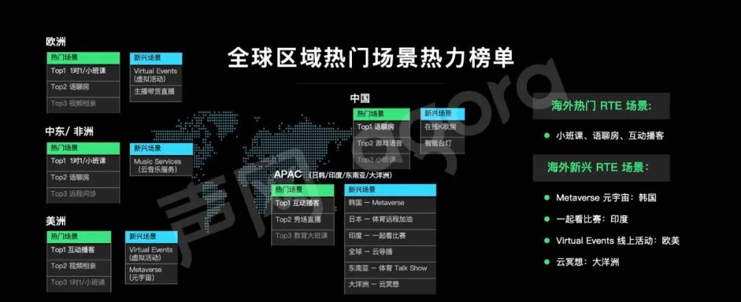 例如,声网Agora 创始人兼CEO赵斌曾在RTE2021实时互联网大会上分享了对于全球各区域热门和创新实时互动应用场景的洞察,他提到,1对1/小班课、语聊房、互动播客已成为全球TOP3的热门场景,而这三种玩法在不同地区又展现出不同形态:1对1和小班课在欧洲、中东、非洲等地区均排名第一;而互动播客则成为亚太地区(包括日韩、印度、东南亚、大洋洲等)及美洲排名第一的热门场景。