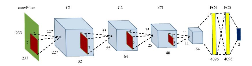 我们所采用的网络结构由 ConvFilter 层,3个卷积层组,2层 FC 层以及1个softmax 分类层组成,模型的输入是二进制的图片格式。其结构如下图2所示:我们的输入是一张233*233的 RGB 图像,用绿色方块表示;红色方块代表卷积核,靠近它的数字代表该卷积核的尺寸,左侧的红色方块代表一个7*7的卷积核;特征图则由阴影部分的长方体所示。