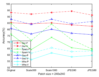 下图 3 展示了我们的方法与三种人工设计特征的方法在不同尺寸图像块上的分类精度。与其他三种方法相比较,我们的方法在任何图像块尺寸上的准确率都更高,且随着图像块尺寸的缩小,网络的分类准确率会降低。