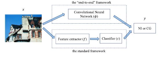 相比于需要先验知识和假设条件的传统方法,卷积神经网络 (CNN) 能够自动地从数据中学习目标的特征及其抽象表征,这使得它能够更广泛适用于一些复杂的数据库。本文,我们提出一种基于 CNN 的框架来识别 NIs 和 CG。这是一种以端到端的方式进行自动特征学习,而无需进行人为设计图像特征的框架。我们的工作主要总结如下: