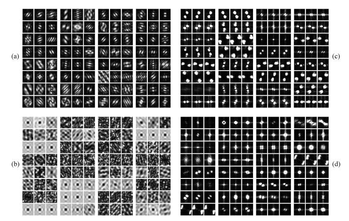 在计算机视觉任务中,CNN 的训练普遍存在一种现象:即模型在第一层学习的卷积核类似于 Gabor 滤波器和 color blobs。我们在下图 5 展示了模型的卷积可视化结果,其中 (a) 表示我们模型的第一层卷积核的傅里叶变换 (FFT) 结果, (b) 表示预训练的 CaffeNet 的结果,(c) 是对应于 CaffeNet 中第一层的前96个卷积核的可视化结果,而 (d) 则对应于最后的96个结果。滤波器根据三个颜色通道 B,G 和 R 被分为3个组,而像素越亮则代表所对应的B,G,R的值越高。