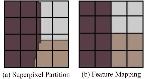 图 2 卷积神经网络的特征网格单元与超像素等级结构之间的映射关系。卷积网络中的某一层的特征网格单元被映射到对应的超像素等级中去,并被指定给当前超像素等级中与其重叠度最高的超像素。每个超像素都会收到来自同等级多个网格单元的映射。