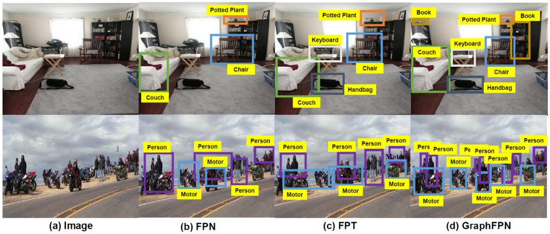 图 3 GraphFPN与FPN和FPT在MS-COCO数据集上的部分检测结果对比