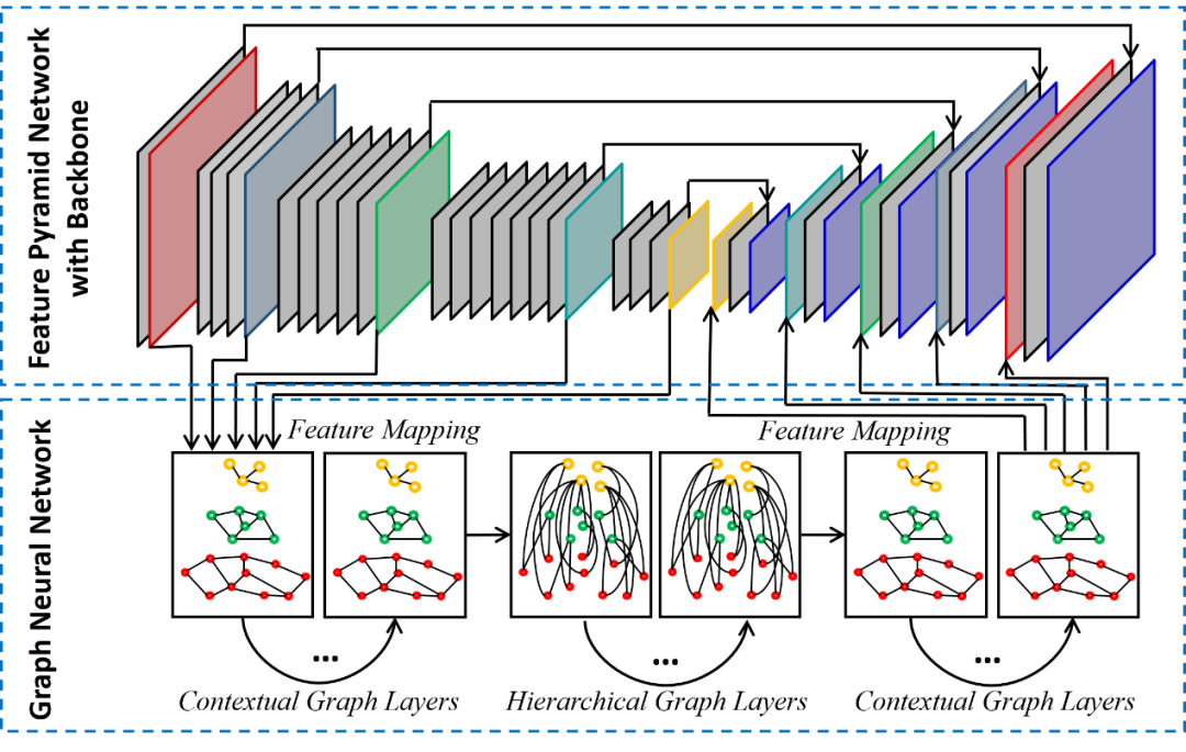 图 1 图特征金字塔网络(GraphFPN)是一个建立在超像素等级上的图神经网络。图特征金字塔网络接受来自卷积主干网络的多尺度特征。这些卷积特征被一种特征映射机制映射到图神经网络的节点中,通过GraphFPN中多个上下文相关层和等级间交互层进行特征融合,最终被反映射回卷积神经网络中进行随后的物体检测。
