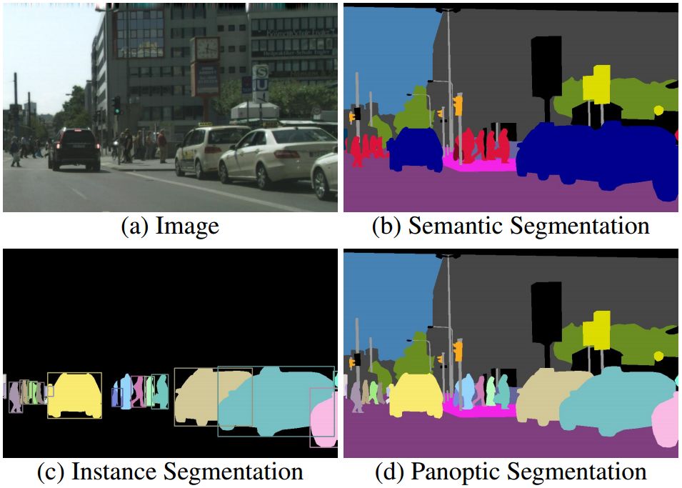 对于给定的(a)图像,我们展示了以下任务的参照标准:(b)语义分割(每个像素具有类标签),(c)实例分割(每个目标具有掩码和类标签),以及(d)提出的全景分割(PS)任务(每个像素具有类+实例标签)。全景分割泛化了语义和实例分割,并要求识别和描绘图像中的每个可见的目标和区域。我们希望这个统一的分割任务能够提出新的挑战,并创造新的方法。