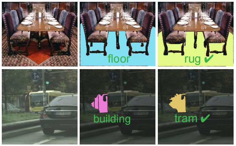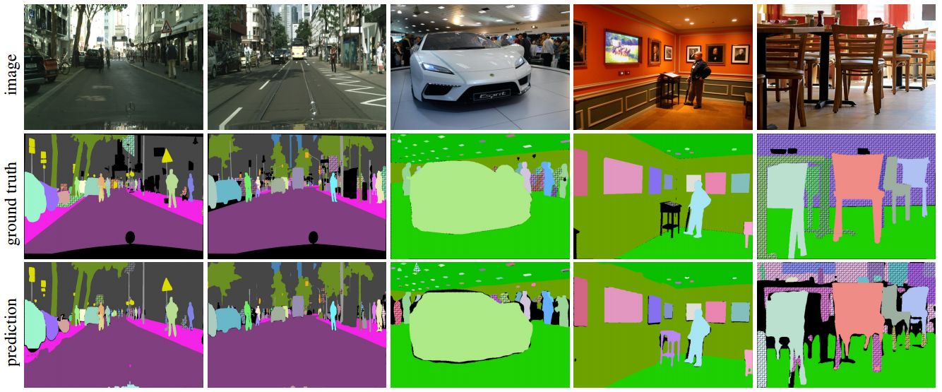分类瑕疵。图像被缩放和裁剪。顶部行(ADE20k图片):简单的错误分类。底行(Cityscapes图像):现场是非常困难进行分类的的,有轨电车是正确的分类。其中许多错误难以解决。