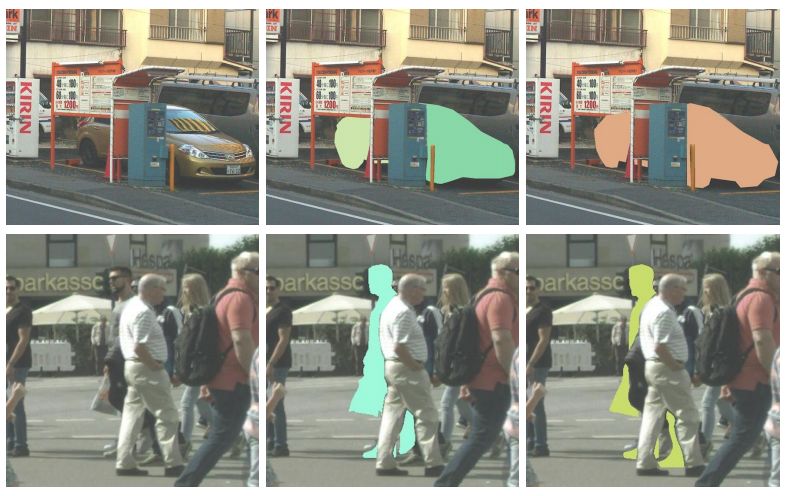 分割瑕疵。图像被缩放和裁剪。顶部行(Vistas图像):两个注释器都将目标识别为一辆汽车,然而,人将一辆汽车分成了两辆车。底行(Cityscapes图像):分割是非常模糊的。