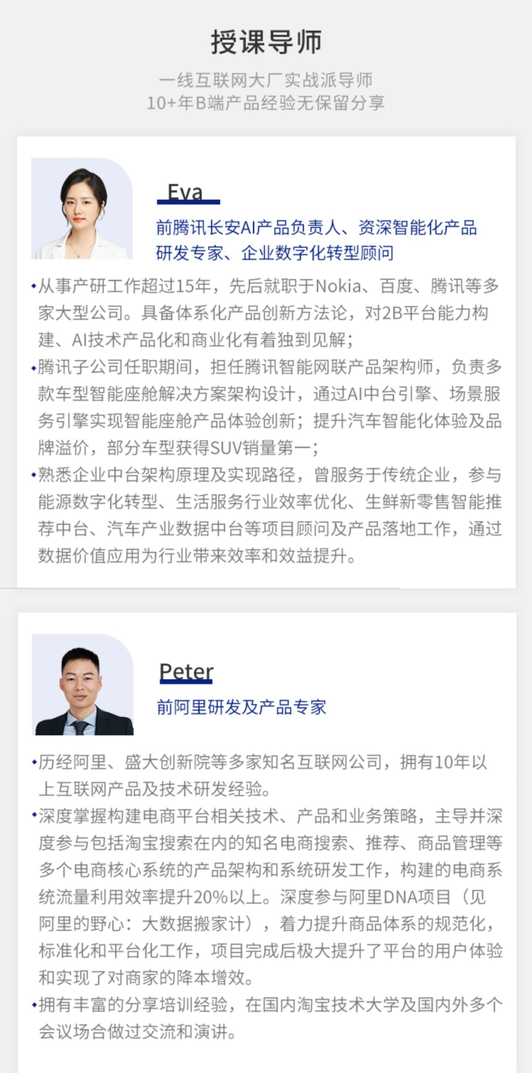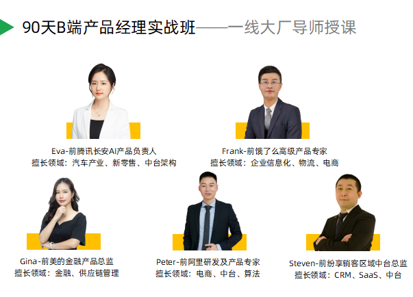 由起点课堂(原起点学院)联合业内资深B端产品专家:前腾讯长安AI产品负责人@Eva、前阿里高级产品专家@磊叔、前饿了么高级产品专家@Frank、前美的金融产品总监@Gina、现任一号互联产品专家@王鹏共同研发。