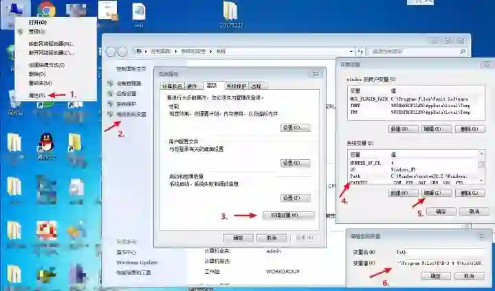 “此电脑”>“属性”>“高级系统设置”>"高级”>“环境变量”>“path">"编辑”