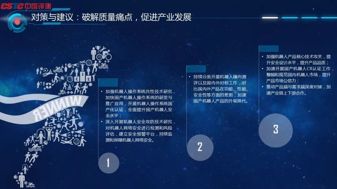 针对以上机器人产品质量6大痛点,中国软件评测中心机器人测试实验室主任巩潇表示,应加强机器人操作系统、安全攻防等共性技术研究,持续分类开展机器人横向测评以及国内外对标工作,对比国内外产品在功能、性能、安全性等方面的差距,加速国产机器人产品的升级换代,加速开展国产机器人CR认证工作,规范国内机器人市场,提升产品市场公信力。