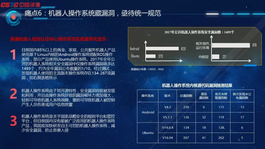 根据赛迪机器人检测认证中心操作系统实验室研究:2017年全年公开的机器人系统相关安全漏洞中仅操作系统相关漏洞就多达1493个,约为全年漏洞公布数量的1/10。目前国内85%以上的商业、家庭、公共服务机器人产品使用基于Linux内核的Android操作系统搭配ROS操作系统,部分产品使用Ubuntu操作系统。经过测试发现,机器人使用的主流版本操作系统存在134-267项漏洞,且存在可提权漏洞,直接威胁机器人及其应用系统的安全。