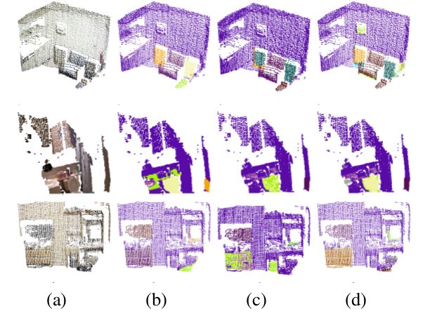 图5:展示了SGPN在NYUV2上的实例分割结果。(a)是输入点云,(b)是真实实例分割结果,(c)是SGPN的分割结果,(d)是将SGPN与2D CNN整合得到的结果。