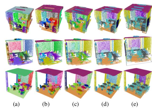图4:展示了SGPN在S3DIS上的结果。(a)是实例分割的真实结果,不同的颜色表示不同的实例,(b)是SGPN的实例分割的结果,(c)是Seg-Cluster的实例分割结果,(d)是分割的真实结果,(e)是SGPN的语义分割结果。