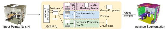 本文提出了相似群建议网络(SGPN),它是一个用于三维点云的实例分割简单直接的深度学习框架。