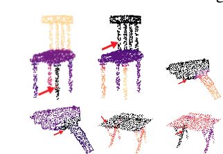 图2展示了SGPN中的相似矩阵的一个可视化结果,表示了一个指定点到其余点的距离。红色箭头处表示的是指定点的位置,点云的颜色表示相似度,黑色表示你距离较近。
