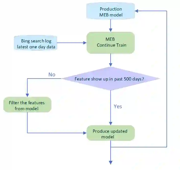 更重要的是,即使在必应中实现后,模型也会每天使用最新的每日点击数据刷新训练数据集,如图 3 所示。为了避免过时特征的负面影响,一个自动过期策略会检查每个特征的时间戳,并过滤掉过去 500 天内未出现的特征。经过持续的训练,模型的日常更新部署得以完全自动化。