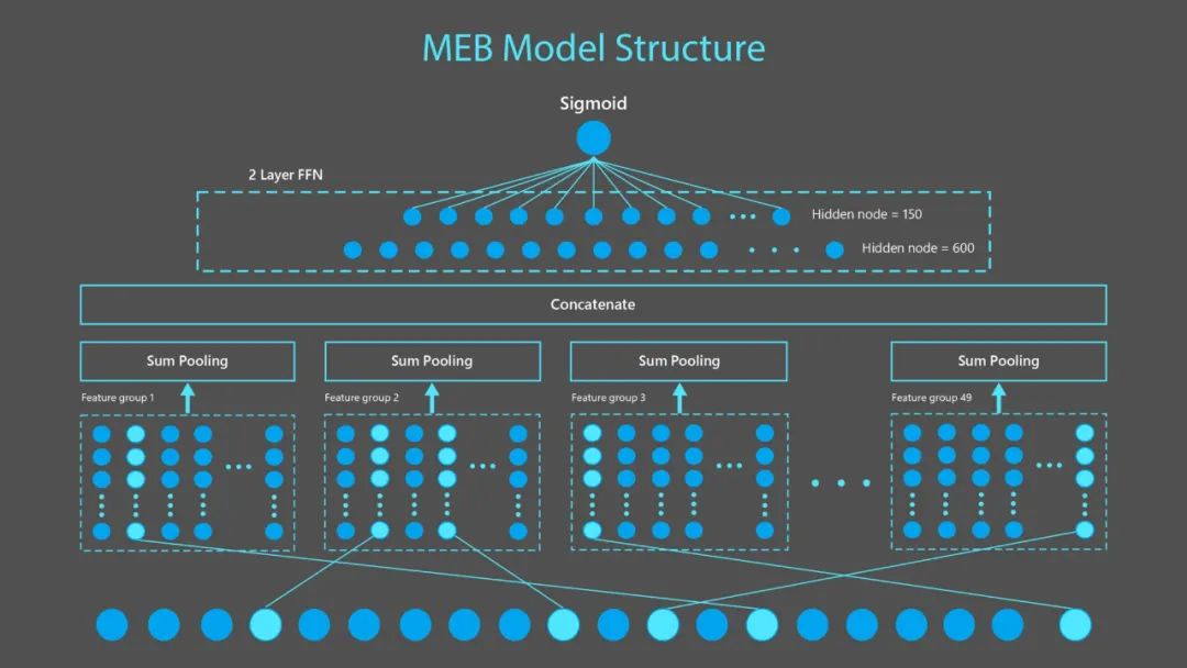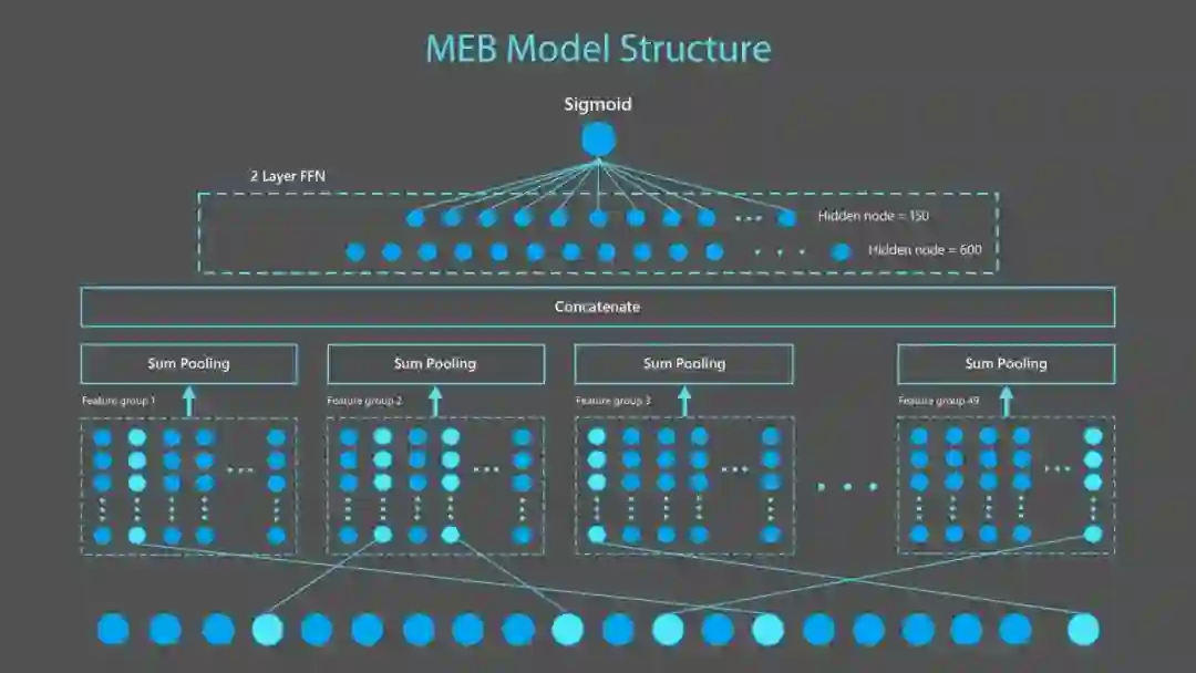 如图 1 所示,MEB 模型由一个二进制特征输入层、一个特征嵌入层、一个池化层和两个密集层组成。输入层包含 90 亿个特征,由 49 个特征组生成,每个二进制特征编码为一个 15 维嵌入向量。在对每组 sum-pooling 和 concatenation 之后,向量通过两个密集层产生一个点击概率估计。
