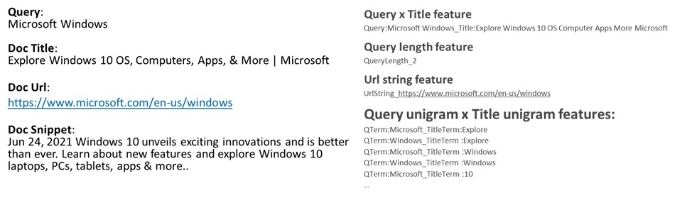 我们还通过组合整个查询文本和文档字段来生成特征。例如,特征“Query_Title_Microsoft Windows_Explore Windows 10 OS Computer Apps More Microsoft”是从 query=“Microsoft Windows”和 document title=“Explore Windows 10 OS Computer Apps More Microsoft”生成的特征。