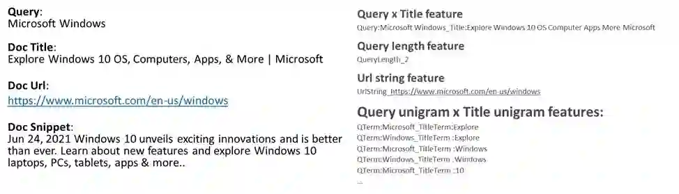 图 2:上面是 MEB 特征外观的一个示例。左侧展示了一个示例查询文档对,其中查询文本、文档标题、URL 和片段作为特征提取的输入。右侧展示了 MEB 生成的一些典型特征。例如,“Microsoft Windows”这个查询和文档标题“Explore Windows 10 OS, Computers, Apps, & More | Microsoft”生成了一个 Query x Title 特征“Query:Microsoft Windows_Title:Explore Windows 10 OS Computer Apps More Microsoft”。由于“Microsoft Windows”这个查询包含两个术语,因此生成了二进制特征“QueryLength_2”。查询词和文档标题词的每个组合都可以生成一个 Query unigram x Title unigram 特征的列表,例如“QTerm:Microsoft_TitleTerm:Explore”等。