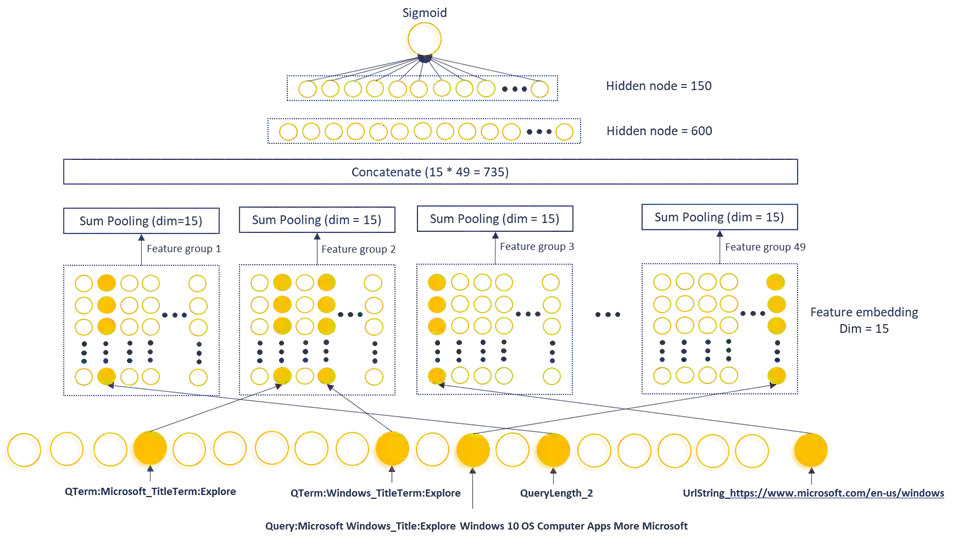 图 1:MEB 是一个稀疏神经网络模型,由一个接受二进制特征的输入层、一个将每个二进制特征转换为 15 维向量的特征嵌入层、一个 sum-pooling 层应用于全部 49 个特征组并通过 concatenation 以产生一个 735 维的向量,然后通过两个密集层来产生一个点击概率。此图中展示的特征是从示例查询“Microsoft Windows”和文档 https://www.microsoft.com/en-us/windows 生成的,如图 2 中所述。