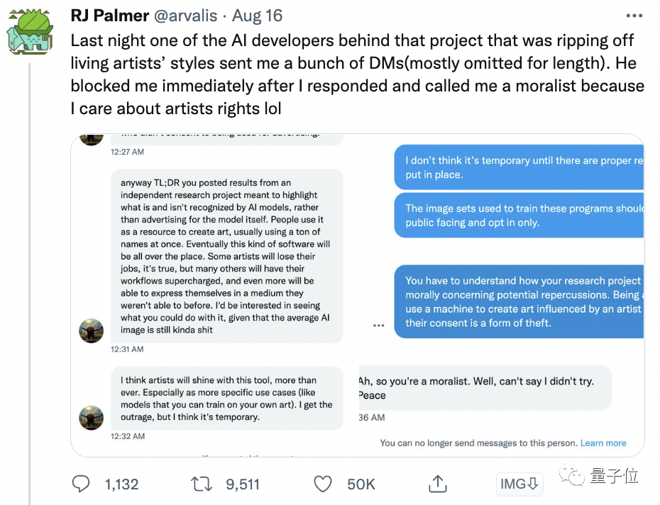 因为Stable Diffusion使用过于泛滥,牵涉到艺术版权的问题,一群艺术家们吵得不可开交,闹到把一个非官方账号举报到了封号。