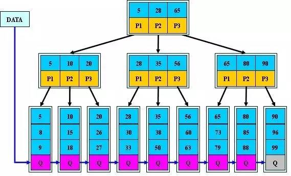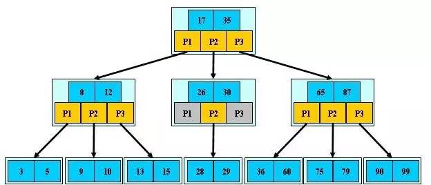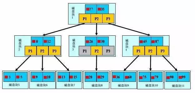 如上图,是一颗b+树,关于b+树的定义可以参见B+树,这里只说一些重点,浅蓝色的块我们称之为一个磁盘块,可以看到每个磁盘块包含几个数据项(深蓝色所示)和指针(黄色所示),如磁盘块1包含数据项17和35,包含指针P1、P2、P3,P1表示小于17的磁盘块,P2表示在17和35之间的磁盘块,P3表示大于35的磁盘块。真实的数据存在于叶子节点即3、5、9、10、13、15、28、29、36、60、75、79、90、99。非叶子节点只不存储真实的数据,只存储指引搜索方向的数据项,如17、35并不真实存在于数据表中。