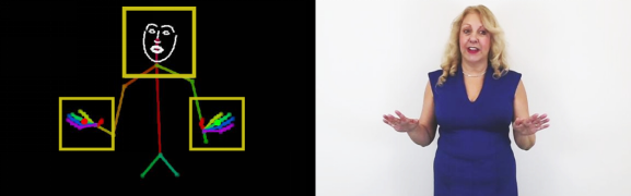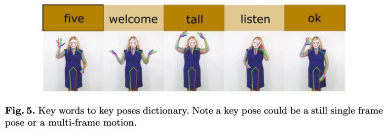 在成功同步语音和动作的同时,LSTM 大部分时间只能学习重复的人类动作,这会使视频看起来很无聊。为了使人体动作更具表现力和变化性,研究者在一些关键词出现时将特定姿势加入 LSTM 的输出动作中,例如,巨大、微小、高、低等。研究者建立了一个字典,将这些关键词映射到它们相应的姿势。
