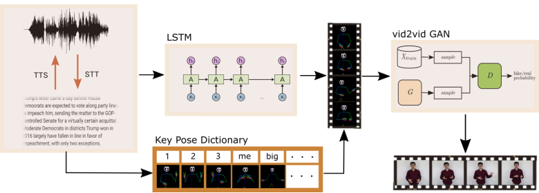 近日,百度提出了一种新的方法,将给定文字或音频转换为具有同步、逼真、富表现力的肢体语言的实感视频。该方法首先使用递归神经网络(recursive neural network,RNN)从音频序列生成 3D 骨骼运动,然后通过条件生成对抗网络(GAN)合成输出视频。