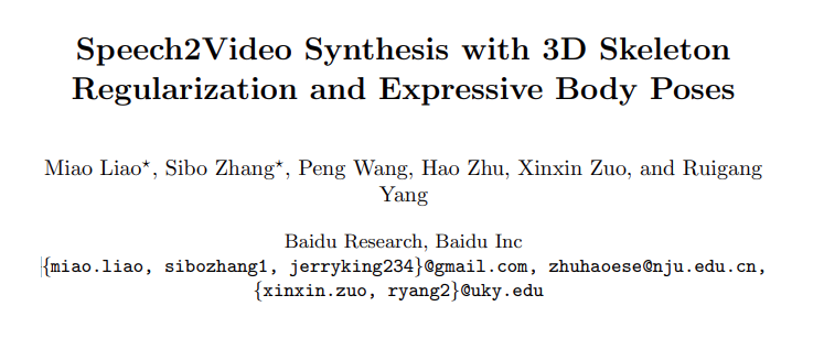 本文来自百度研究院被亚洲计算机视觉会议 ACCV 2020 接收的一篇论文《Speech2Video Synthesis with 3D Skeleton Regularization and Expressive Body Poses》。