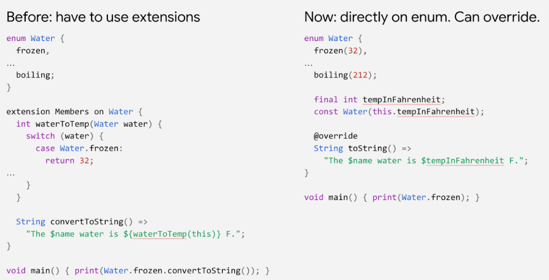 枚举非常适合用来表示一组离散的状态。例如,我们可以将水描述为 enum Water { frozen, lukewarm, boiling }。但是,如果我们想在 enum 上添加一些方法,例如,将每个状态转换为温度,以及支持将 enum 转换为 String,该怎么办?或许我们可以使用扩展方法来添加一个 waterToTemp() 方法,但必须注意让其与 enum 保持同步。对于 String 转换,我们希望重写 toString(),但这个做法在之前的版本不受支持。