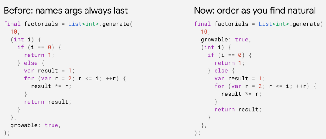 最后,我们改进了调用某个方法时命名参数的使用方式。此前,命名参数只能出现在方法参数列表的最后。如果您希望让位置参数靠后,从而提升代码可读性,这种限制就会令人感到非常烦恼。以下面