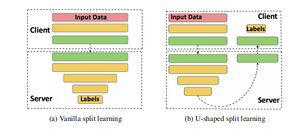 分割学习的关键思想是在客户端和服务器之间执行基于每层的分割模型,并应用于训练和推理。分裂学习最简单配置是每个客户端计算通过深层网络前向传递,然后切割层的输出,即粉碎数据被发送到另一个服务器或客户端,然后由此服务器或客户端完成剩余的计算。这意味着让不共享的数据发生前向传播;最后可以以类似的方式将梯度从其最后一层反向传播到切割层。注意此过程会一直持续到收敛。