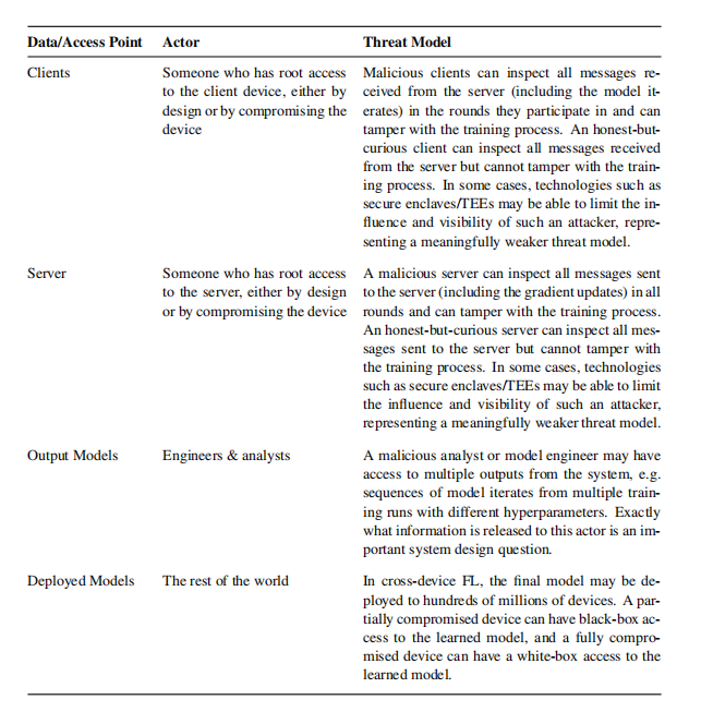 论文中在这一章对现有的成果进行了概述,并介绍了如何设计,才能够提供严格隐私保障,以及现在联合学习系统所面临的挑战。当然,除了针对用户隐私的攻击之外,还有其他类别的针对联合学习的攻击;例如,对手可能试图根本阻止模型训练,或者试图让模型产生偏见。