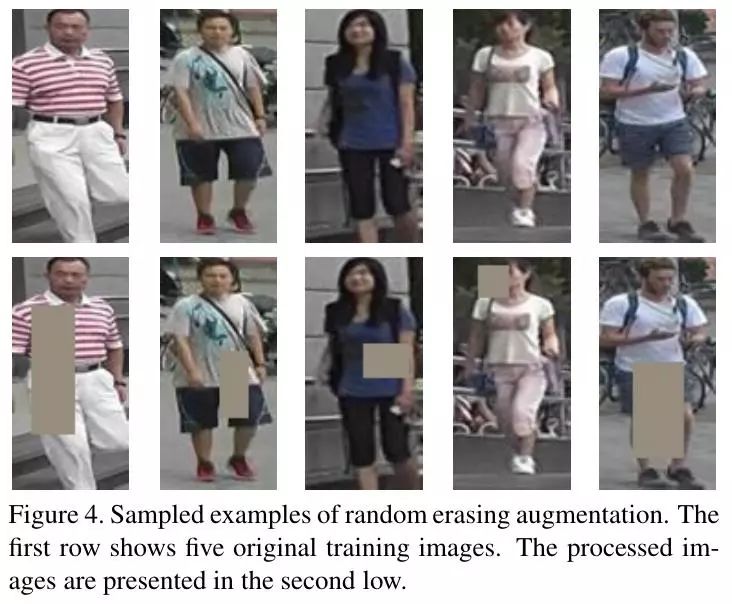这是进行分类问题常见的数据增强方式,对行人检测十分有效!在行人重识别中特别是现实生活中,大部分人体会存在遮挡的情况,为了使模型更具有鲁棒性,我们对每个mini-batch使用REA(RandomErasing Augmentation),REA随机选择一个大小为)的正方形区域,然后对这个区域的像素用一些随机值代替。其中擦除区域面积占比,擦除区域长宽比,,随机概率为0.5,具体算法如下: