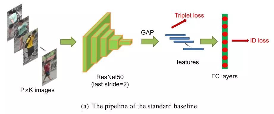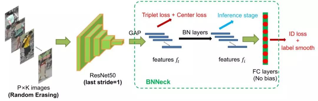 使用一个带有ImageNet预训练参数的ResNet50,并改变FC的输出为N,也就是训练集中行人的ID。